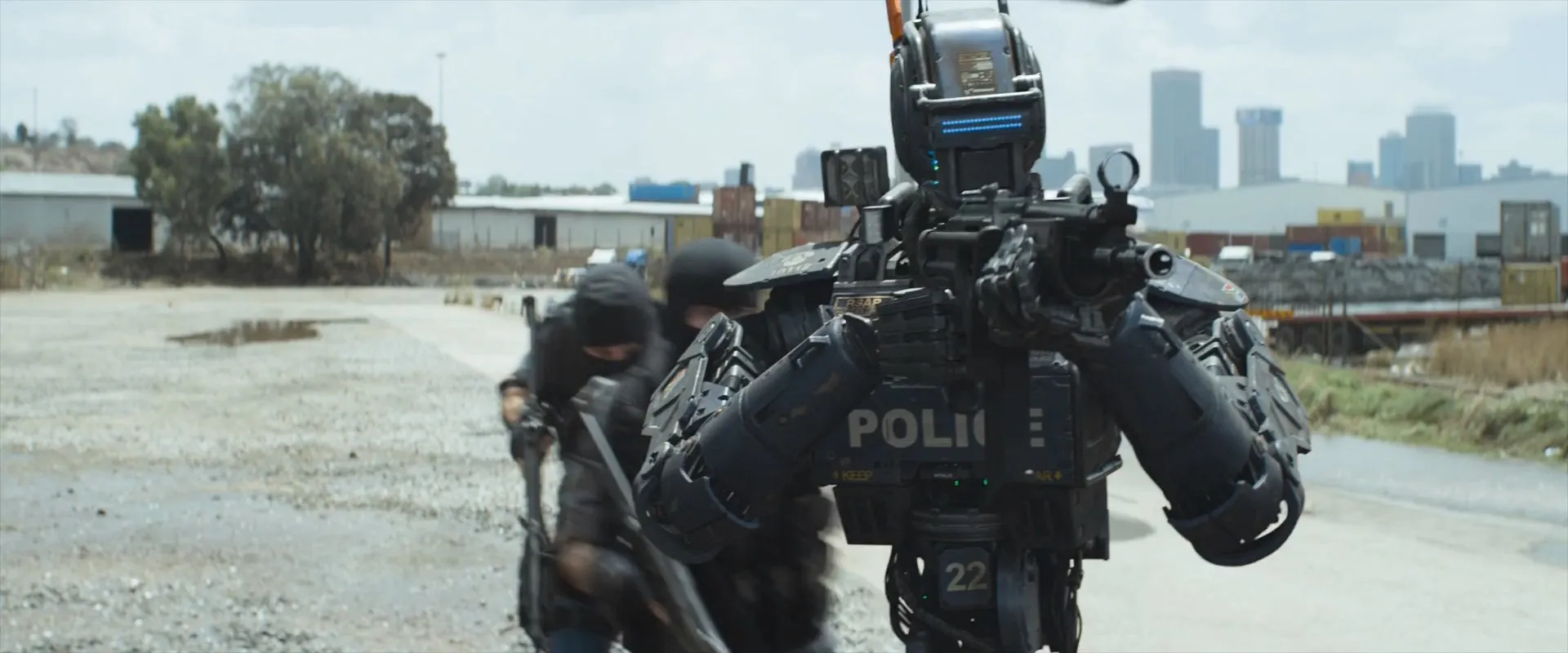 Cast: Sharlto Copley as Chappie, Dev Patel as Deon Wilson, Hugh Jackman as Vincent Moore, Ninja as Ninja, Yo-Landi Visser as Yo-Landi, Sigourney Weaver as Michelle Bradley, Chris Shields as Journalist, Anderson Cooper as Anderson Cooper, Jose Pablo Cantillo as Yankie (Amerika), Brandon Auret as Hippo, Johnny Selema as Pitbull, Maurice Carpede as Police Chief, Jason Cope as Tetravaal Lead Mechanic, Kevin Otto as CNN Reporter, Bill Marchant as Professor, Robert Hobbs as The Procurement Officer, Eugene Khumbanyiwa as King, Mark K. Xulu as Gang Member, Sherldon Marema as Gang Member, Shaheed Hajee as Gang Member, James Hendricks as Gang Member, Julian Brits as Gang Member, David Davadoss as Mercedes Benz Driver, Anneli Muller as BMW Driver, Kendal Watt as Nissan Driver, Chan Marti as Field Reporter, Vuyelwa Booi as Field Reporter, Mike Blomkamp as Police Officer, Anthony Bishop as Police Officer, Paul Dobson as Police Robot (voice), Max Poolman as Hippo's Thug, Alistair Prodgers as Tetravaal Mechanic, Wandile Molebatsi as Armored Truck Guard, Arran Henn as VSN News Desk Reporter, Thami Ngubeni as VSN News Desk Reporter, James Bitonti as Gun Store Owner, Andea Volschenk as Tetravaal Office Assistant, Hein De Vries as Special Forces Soldier, Dan Hirst as Merc, Paul Hampshire as Merc, Graeme Duffy as Tech (uncredited), Miranda Frigon as Psychologist (uncredited), Edwin Gagiano as Office Worker (uncredited), Sean O. Roberts as Hacker (uncredited)
